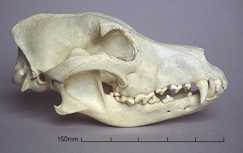 Skull of German Shepherd Dog Canis familiaris, lateral view.
