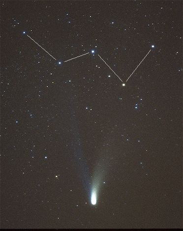 ![]() | Comet Hale-Bopp symmetrically posed with the constellation of Cassiopeia in April. |