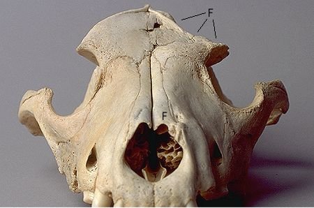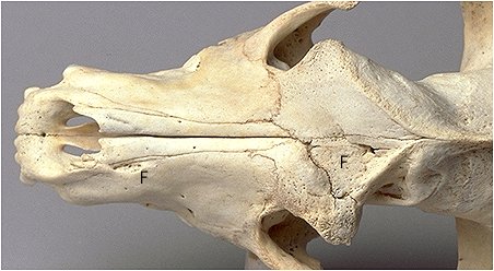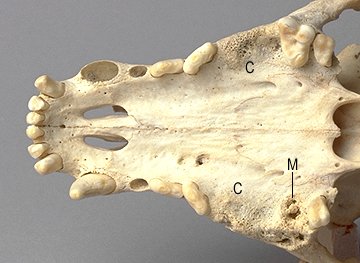 Back to Closer Look index page F - Fractures C - Sites of carnassial teeth, sockets now filled with spongy bone M - Molar tooth recently lost, socketsbeginning to fill with spongy bone. PAGE INDEX1. Greenland Dog skull,