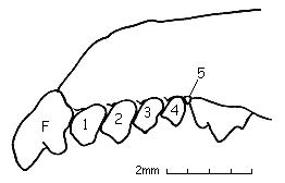 Front upper teeth of Common Shrew, Sorex araneus. 1 - 5) Upper single-pointed teeth. F) First upper tooth. |
