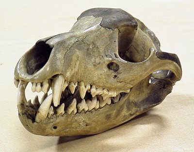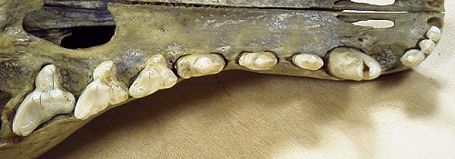 Dental Formula : 4.1.3.4 / 3.1.3.4 (Only 3 upper molars can be seen in this specimen, but the lower 4th molar is only partially erupted, and the animal must therefore have been immature.)